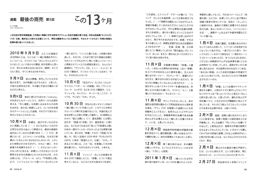 国際映画祭グランプリという栄誉も傑作という評価もこの作品にはどこか馴染まない。かといって慎ましく撮られた小品というには収まらない強度と大胆さに、見るたびに襟を正される。『旅と日々』の複雑な拡がりに迫るには、旅に出るようにでもなく、日々を紡ぐようにでもなく、旅と日々のあいだを揺れ動きながら出会うさまざまな驚きに、その都度向き合うほかないだろう。今回は2本の論考と1万字近い監督インタビューとともに特集をお届けする。